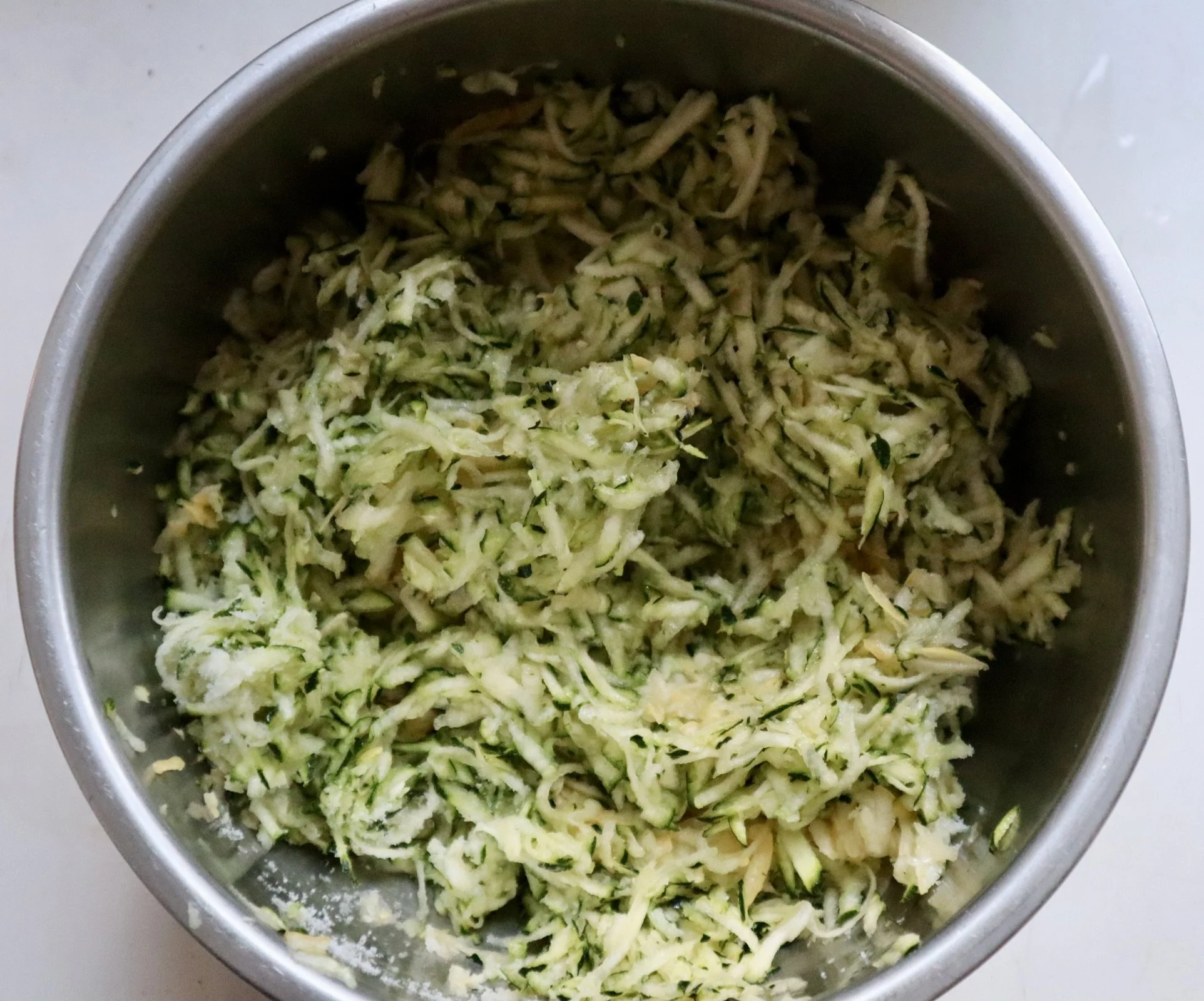 Start with the zucchini. Grate the zucchini in a large bowl. Once it’s all grated, add 2 tsp kosher salt and let sit for 10 - 20 minutes.