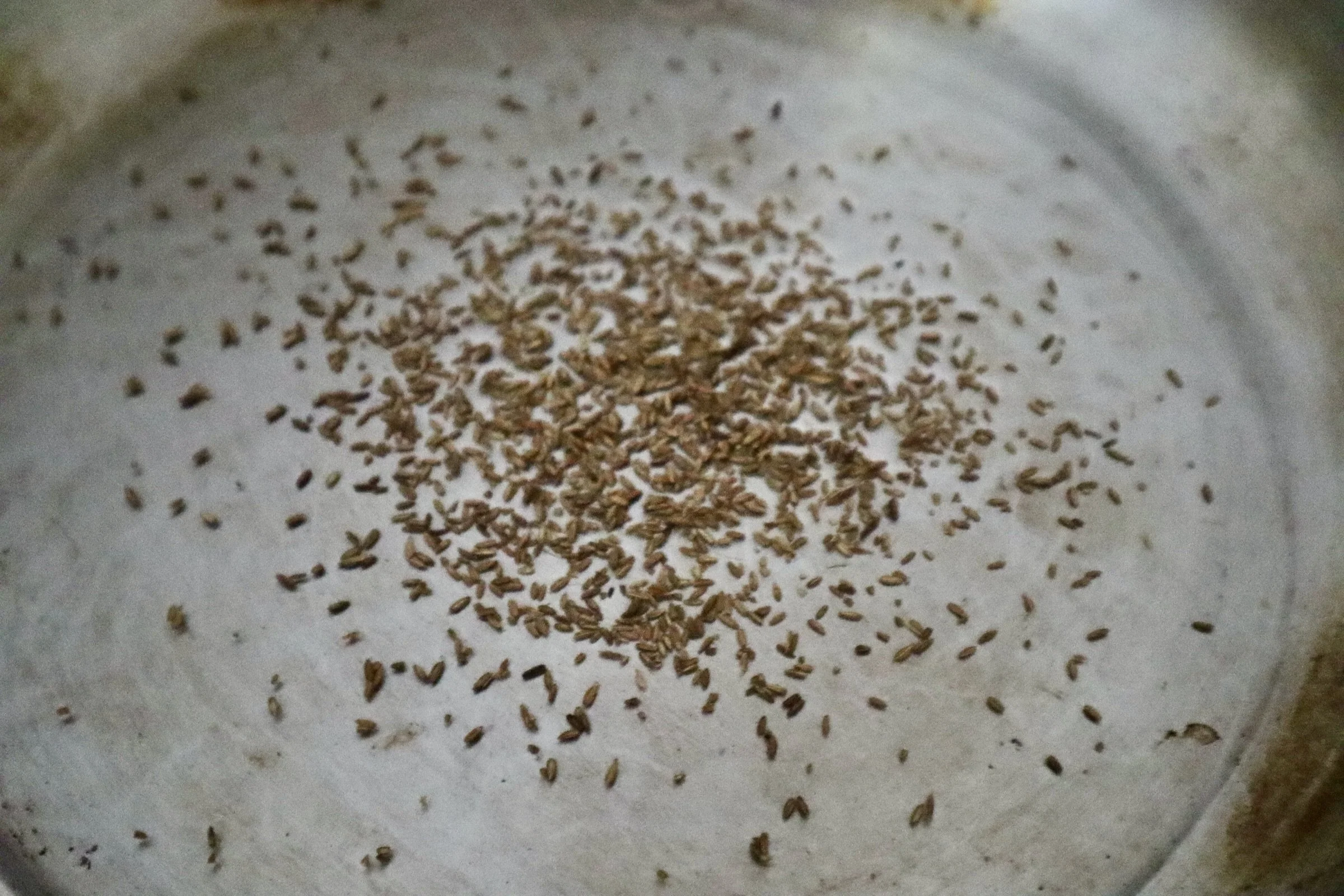 Next, work on your curry. Taking a large sauté pan, heat a tbsp of vegetable oil over medium heat. Add the cumin seeds and let cook until fragrant (about 2 - 3 minutes).
