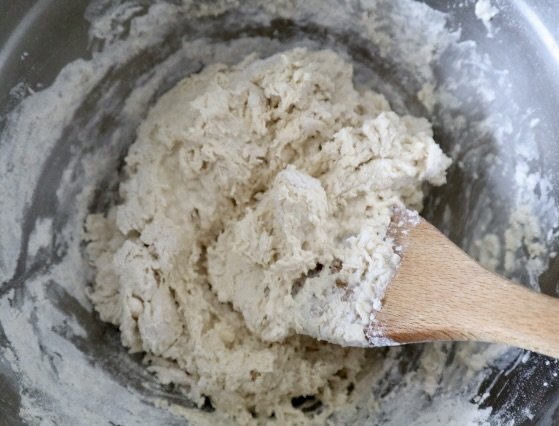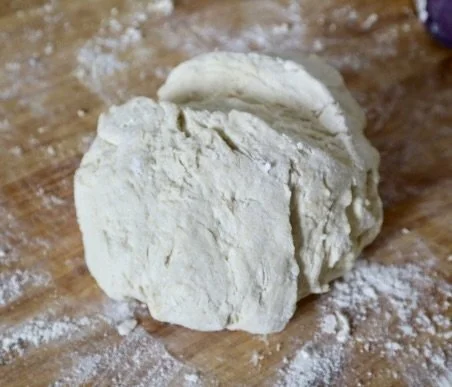 Add the milk and vinegar mixture to this. Mix thoroughly until a dough begins to form. Lightly flour a flat surface and place the dough on this to knead. You won’t need to knead for long - only 1 or 2 minutes - to be sure the dough comes together and doesn’t completely collapse. Form into a large, circular ball and place on your prepared pan.