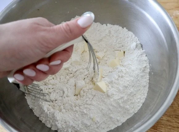 In the meantime, in a large bowl, add the flour, the sugar, baking soda, and salt. Mix thoroughly with a wooden spoon. Add in the butter and using a fork, pastry cutter, or your fingers, cut the butter into the dough until the butter pieces are pea-sized and fully incorporated into the flour mixture.