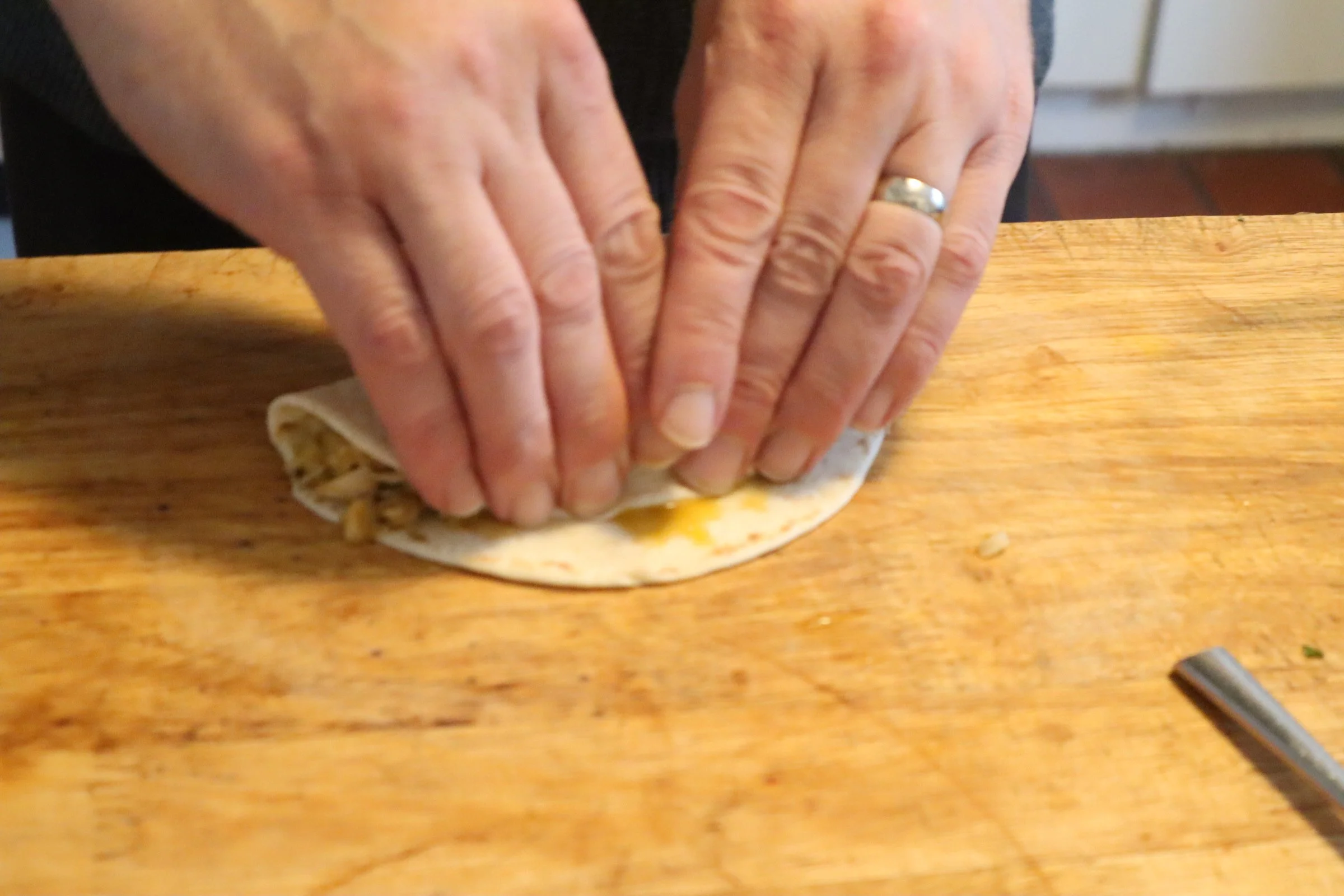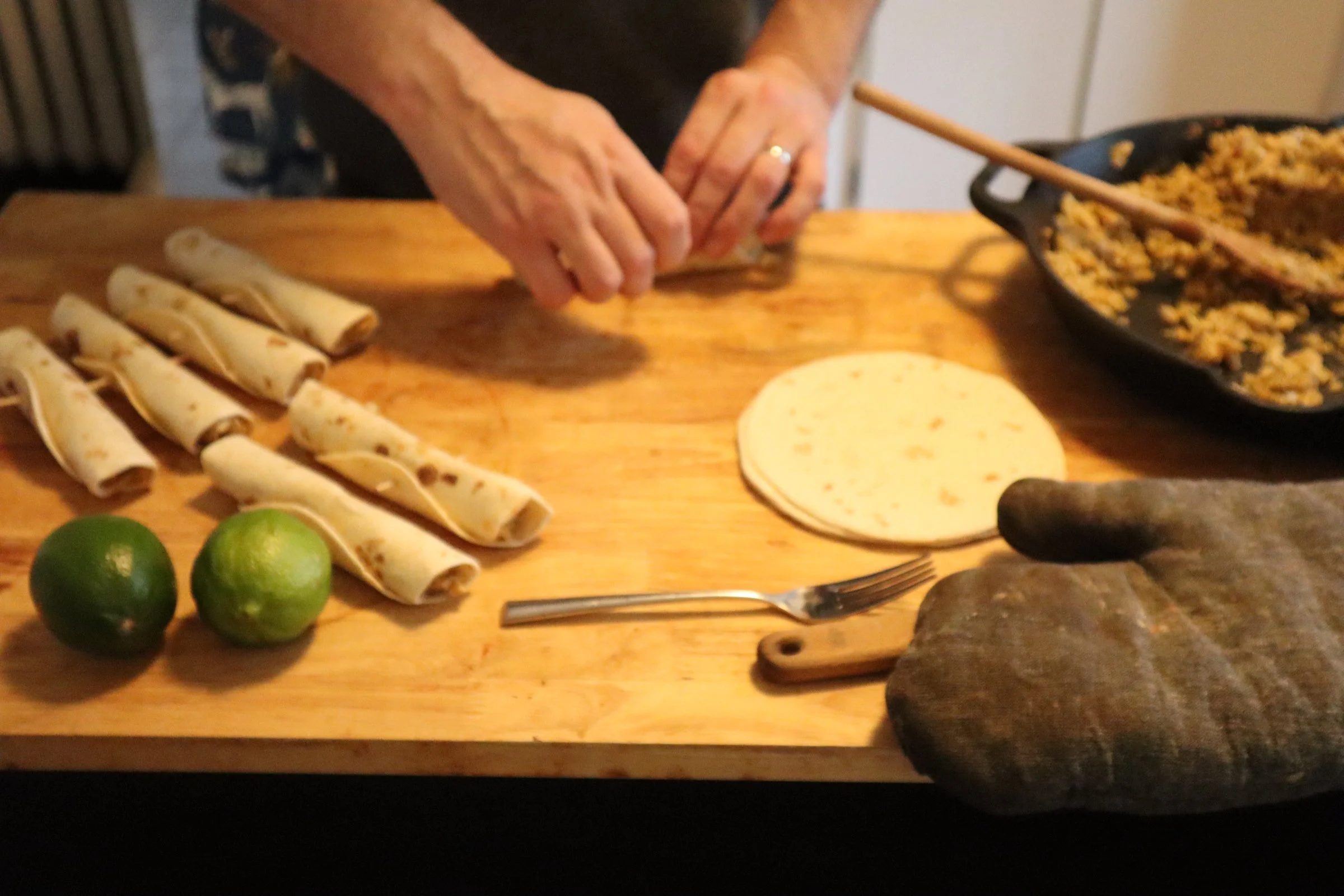 Meanwhile, start assembling your taquitos. Heat your tortillas briefly in a pan (just so they’re warm). Take a 1/4 cup of jackfruit mixture and place at one end of the tortilla. Gently, but tightly fold the tortilla over the mixture, making sure to encompass everything. Once completely folded over, take two toothpicks and place them at each end to hold everything together. Continue until all the tortillas have been assembled.