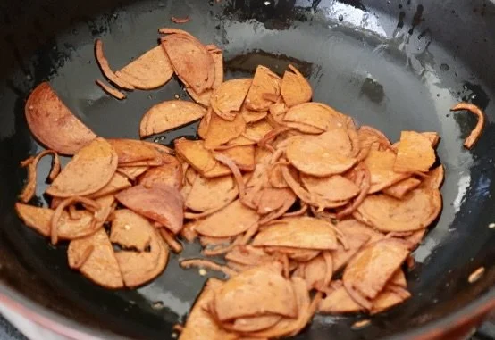 Heat a tbsp of olive oil in a Dutch oven or similar-sized pan over medium heat. Once shimmering, add the pepperoni half-moons. You’ll notice that they start to brown as they cook. Let cook for at least 5 - 6 minutes, or until most of them are nicely browned.