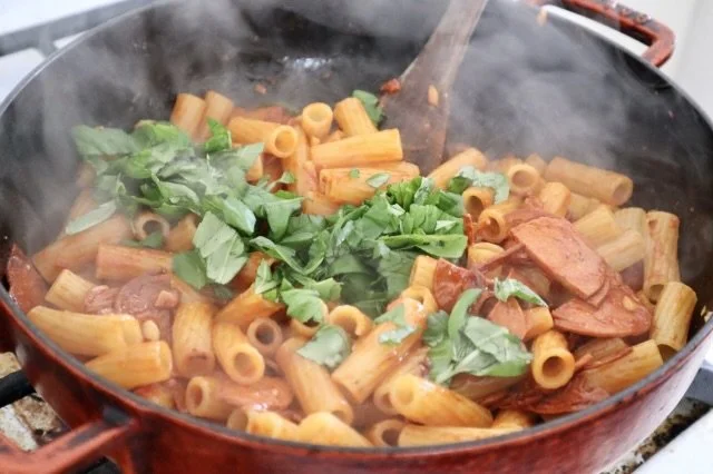 Right at the beginning, pepperoni sets the scene. Adding garlic, red pepper flakes, and basil takes you to another level. The sauce is simplicity itself and comes together quickly with help from the pasta cooking water.