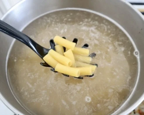 Heat a large pot of water to boiling. Add some kosher salt so the water tastes like the sea. Add the pasta and cook until al dente. Make sure to save a cup of pasta cooking water before draining. Set aside.