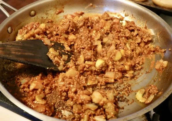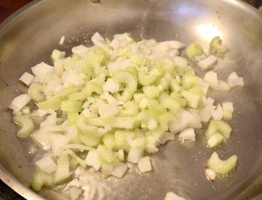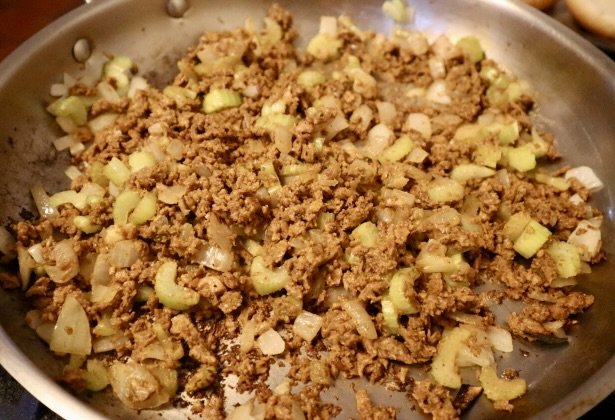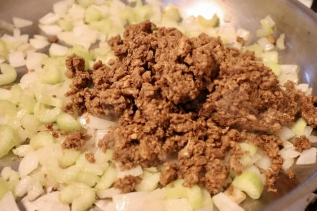 Heat the vegetable oil in a large sauté pan over medium heat. Once the oil is shimmering, add the onion and celery. Sauté until softened, about 5 minutes. Next add your meat. Use a wooden spoon to break up the meat. Let it cook until it’s all browned (about 5-8 minutes).